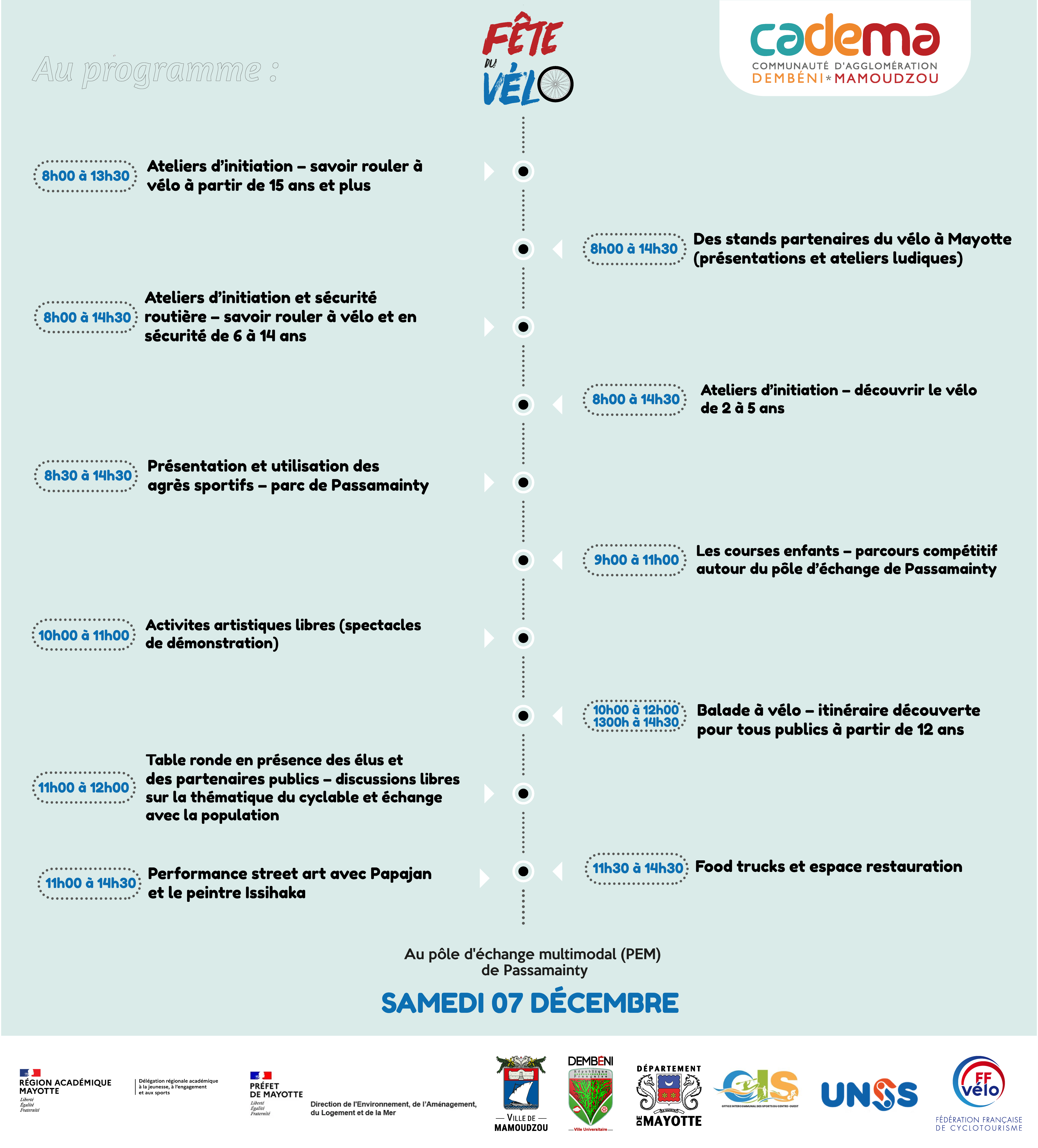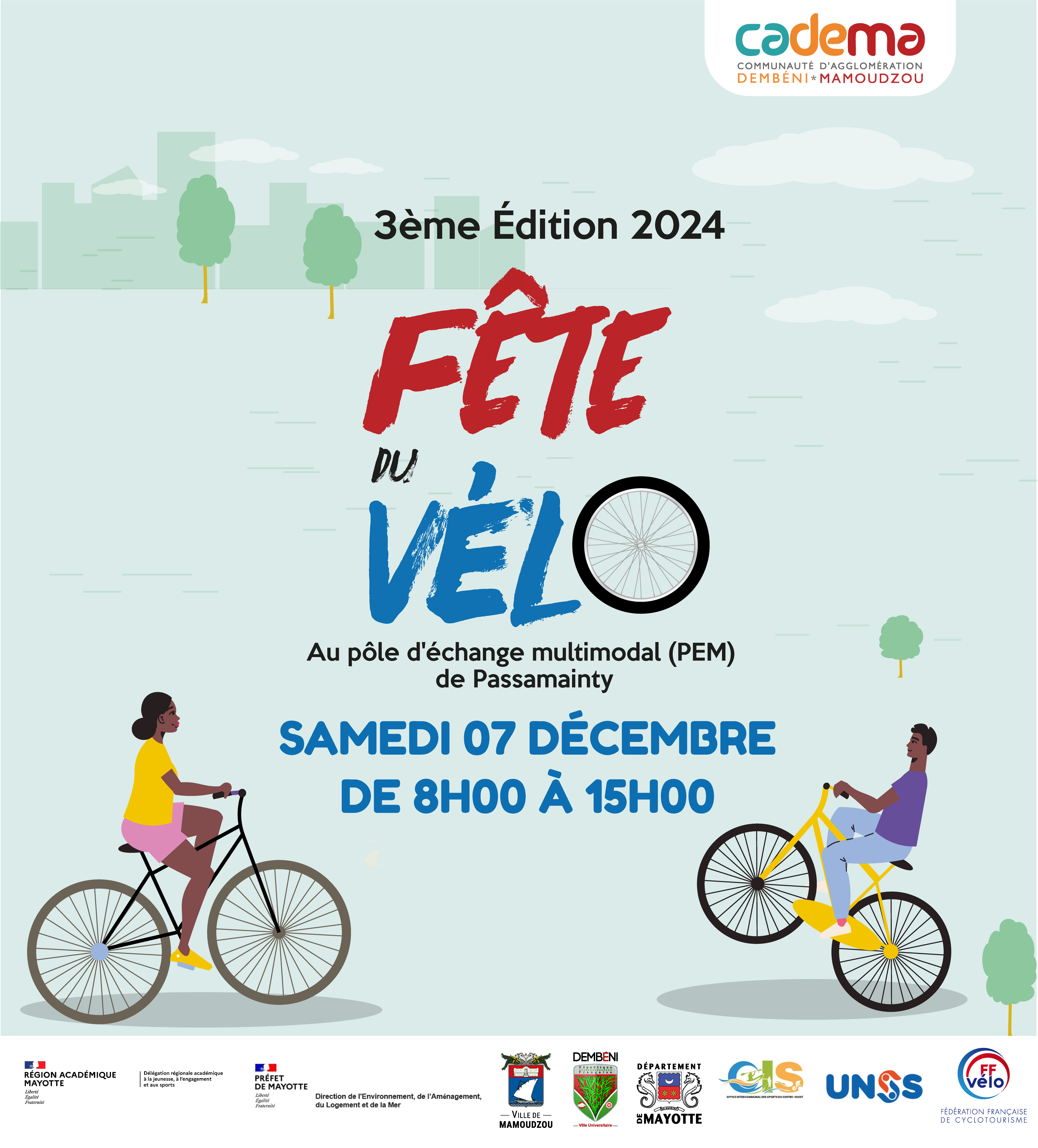 La Communauté d’Agglomération Dembéni-Mamoudzou (CADEMA) et la ville de Mamoudzou organisent à la 3ème édition de la Fête du Vélo, ce samedi 7 décembre 2024, de 8h à 15h au pôle d’échange multimodal de Passamainty .